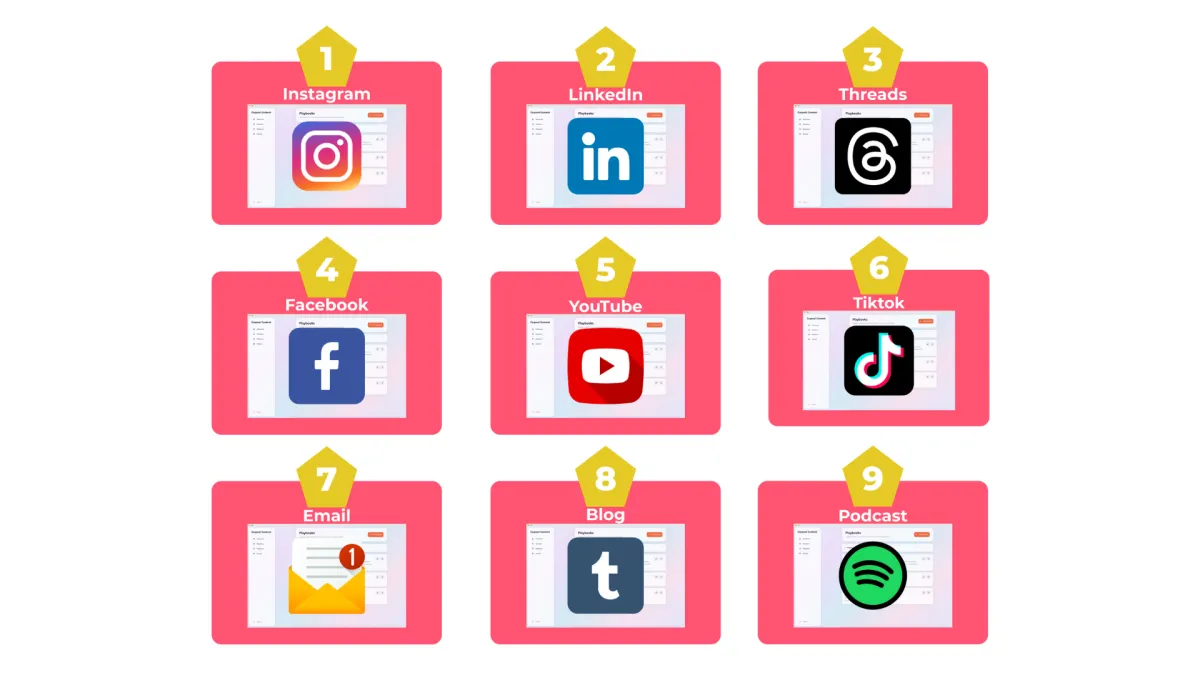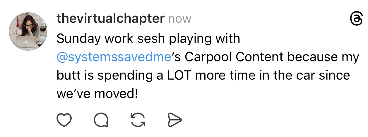Instant access to the Carpool Content tool! Create your content for 9 different platforms from voice notes (sort of like a guest podcast interview!)